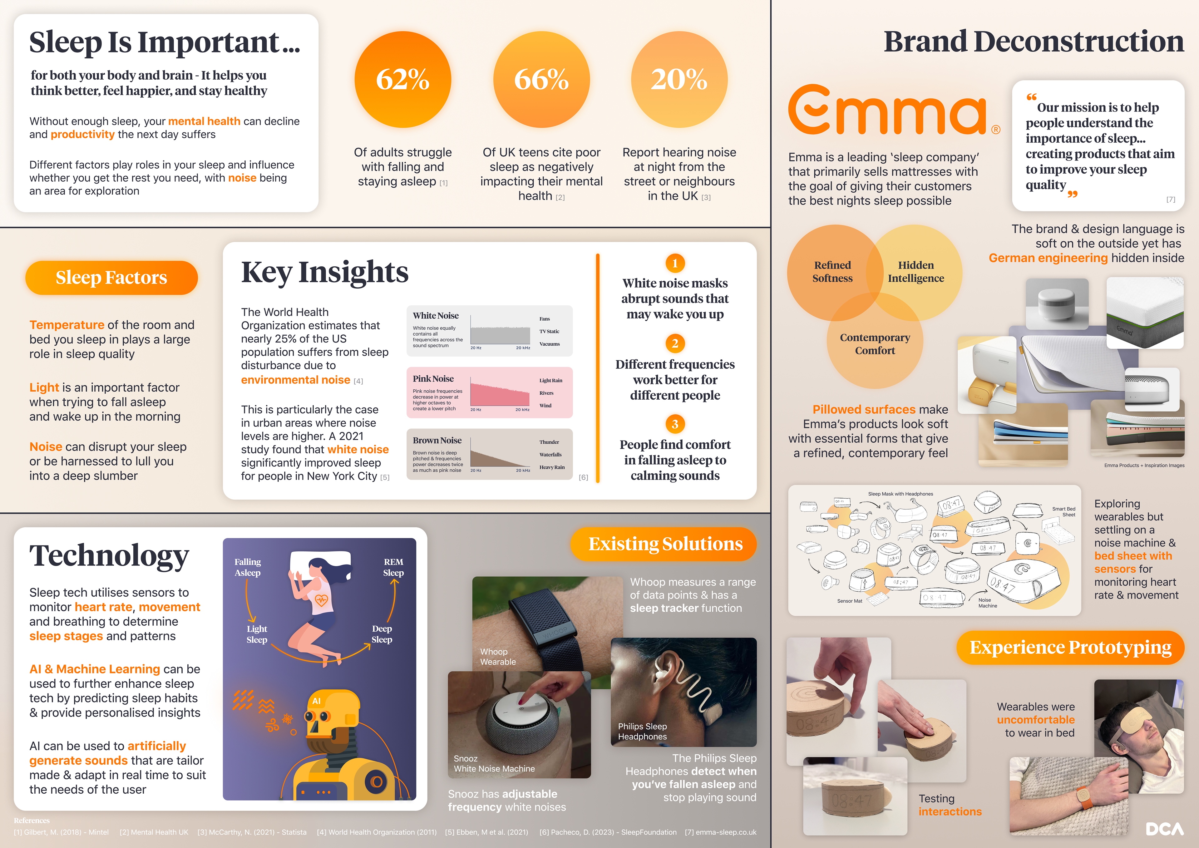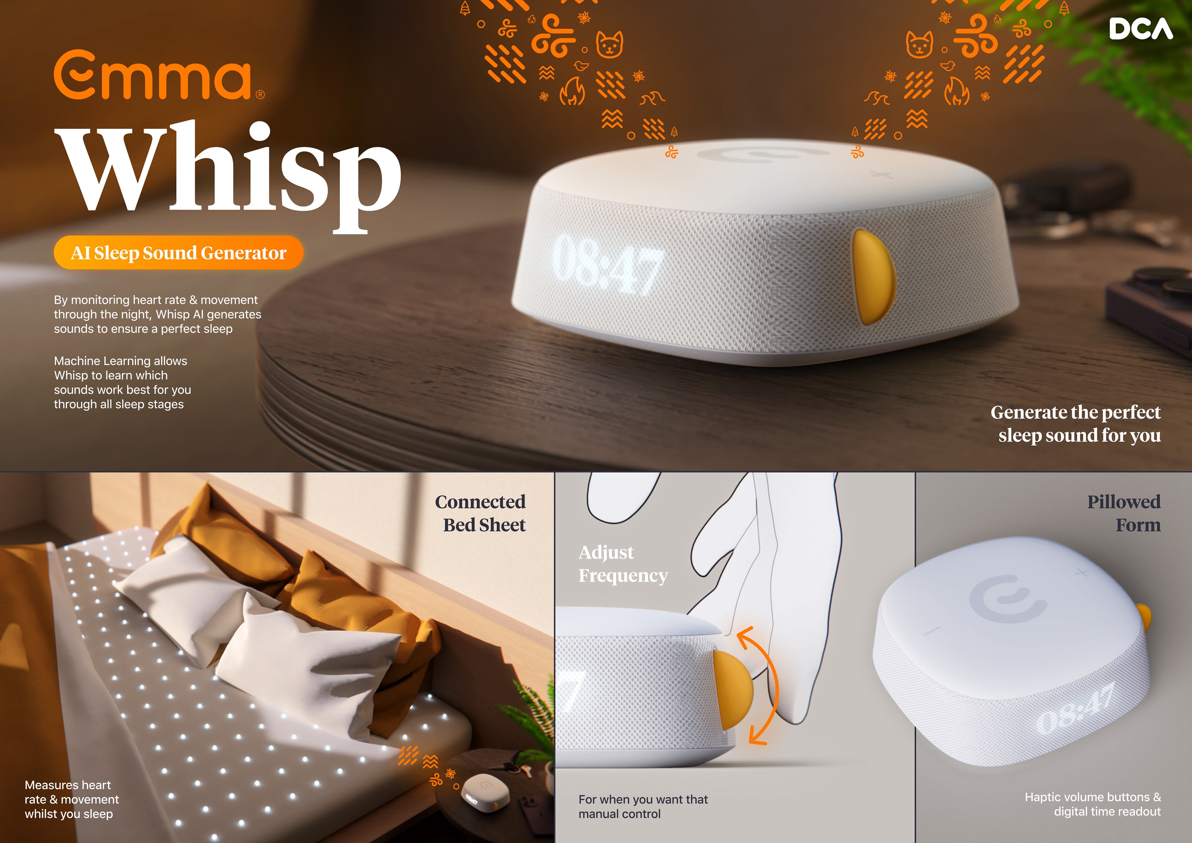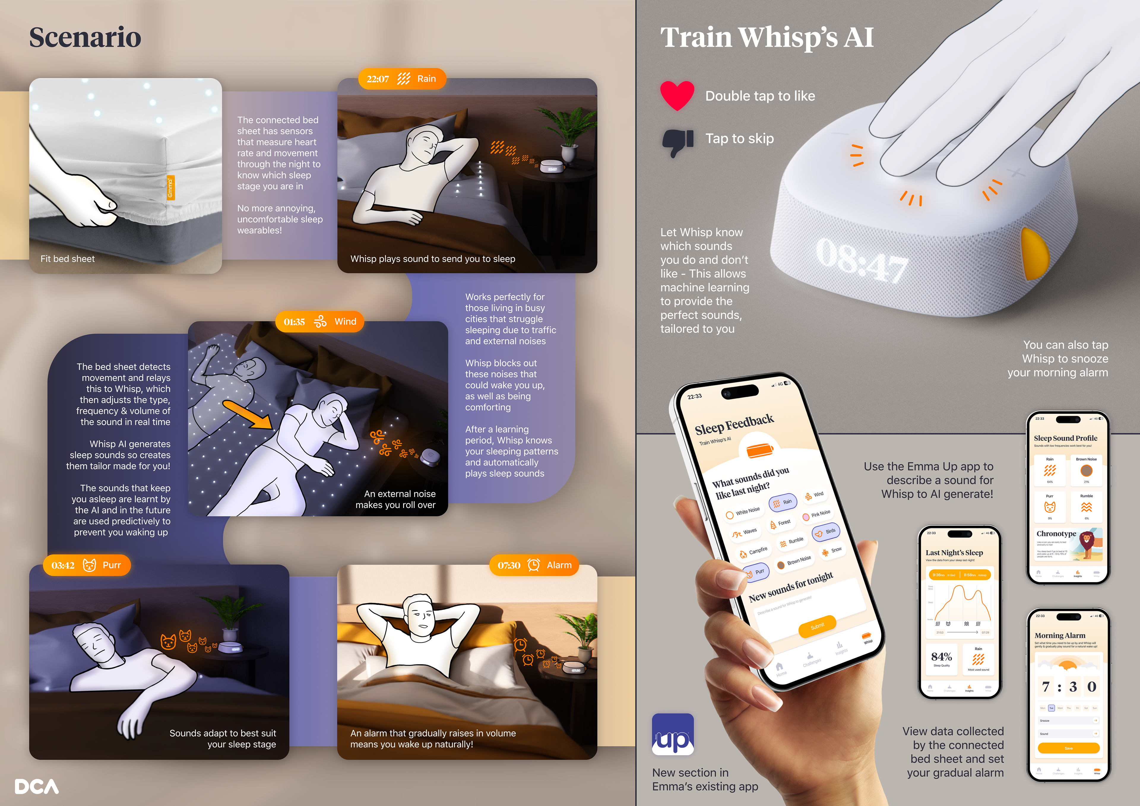 10 day project brief set by DCA - Design for an existing brand, a physical product that leverages AI in a way that is relevant to the brand and their customers Designed in the style for Emma Sleep